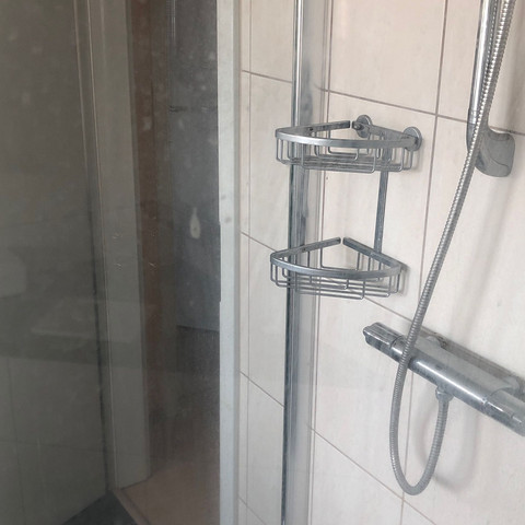 Zuerst geht es darum die duschwanne sowie die waende der duschkabine von seifenresten schmutz und kalk zu saeubern. Genau das machte ich mit einem kuechenmesser habe ich angefangen die silkonverbindungen aufzuschneiden mi der die linke seitenwand an der fliesenwand klebt. Cilitbaeng auch fuer die duschraender und fliesenfugen nehmen aber aufpassen. Vorm einhaengen der tueren ggf.